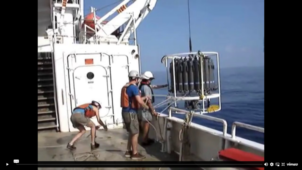 This video shows oceanography in action as scientists aboard the RV Endeavor deploy a CTD rosette from the deck of the ship to collect data and water samples from below the ocean’s surface